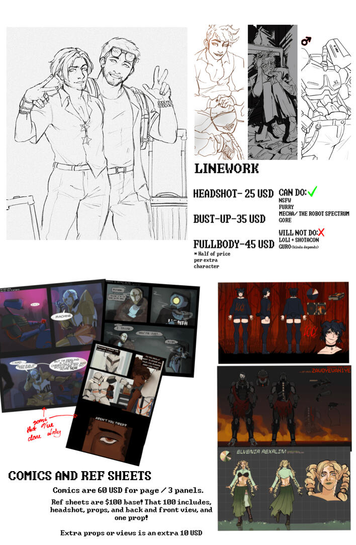 - DM or email [email protected] for inquiry. ( I could not be taking commission at that time )- After sketch review I will ask for half or upfront payment.- Revisions allowed only during linework and sketch phase.